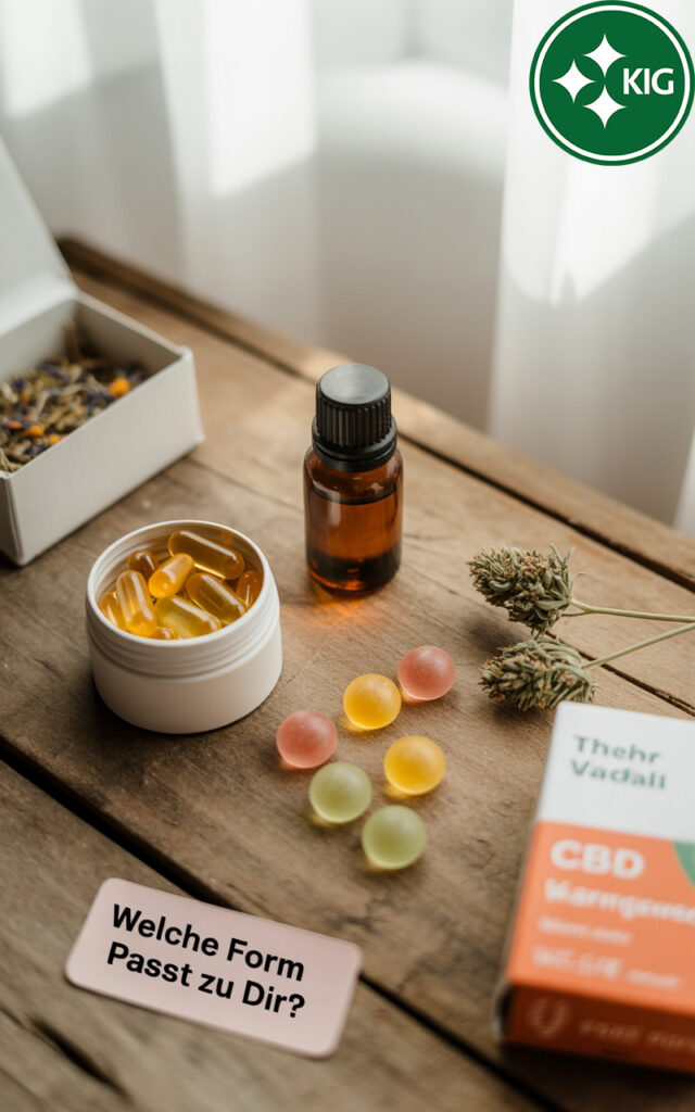Die beliebteste Form ist CBD-Öl, das sublingual (unter die Zunge) eingenommen wird. Es wirkt innerhalb von ca. 30–60 Minuten.