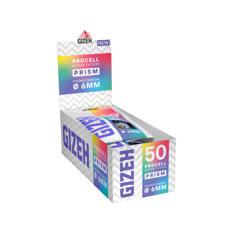 Die GIZEH Prism ProCell Filter (6 mm) revolutionieren dein Raucherlebnis mit innovativen Papierkappen statt Keramik. Buntes Rainbow-Design, optimaler Airflow und nachhaltige Aktivkohle aus Kokosnuss. Erhältlich in 50er und 200er Packungen.